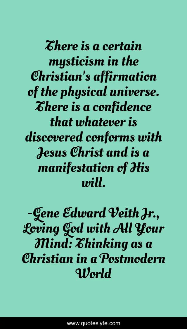 This page presents the quote "There is a certain mysticism in the Christian's affirmation of the physical universe. There is a confidence that whatever is discovered conforms with Jesus Christ and is a manifestation of His will.". Author of this quote is Gene Edward Veith Jr., Loving God with All Your Mind: Thinking as a Christian in a Postmodern World. This quote is about hedonism, creation, sovereignty-of-god, mysticism,.
