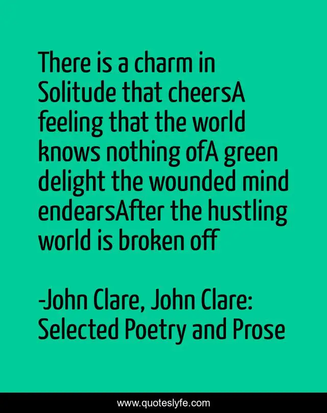 This page presents the quote "There is a charm in Solitude that cheersA feeling that the world knows nothing ofA green delight the wounded mind endearsAfter the hustling world is broken off". Author of this quote is John Clare, John Clare: Selected Poetry and Prose. This quote is about solitude, poetry,.