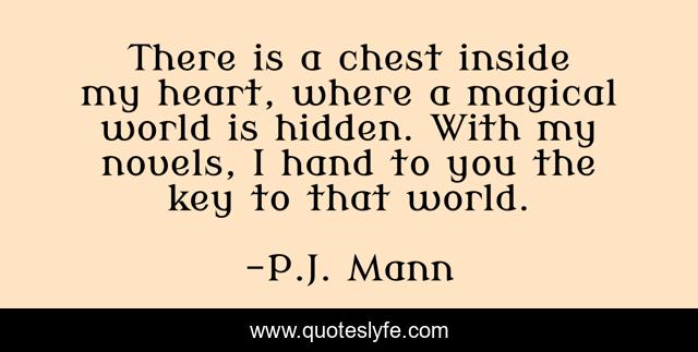 This page presents the quote "There is a chest inside my heart, where a magical world is hidden. With my novels, I hand to you the key to that world.". Author of this quote is P.J. Mann. This quote is about enthusiasm, soul, inspirational, writing-from-the-heart,.