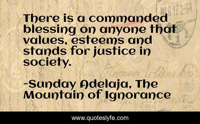 This page presents the quote "There is a commanded blessing on anyone that values, esteems and stands for justice in society.". Author of this quote is Sunday Adelaja, The Mountain of Ignorance. This quote is about mountain, life, darkness, power, danger, justice, god, blessing, people,.