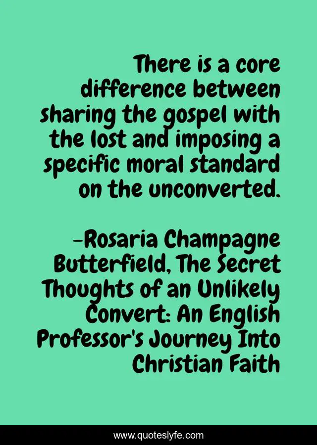 This page presents the quote "There is a core difference between sharing the gospel with the lost and imposing a specific moral standard on the unconverted.". Author of this quote is Rosaria Champagne Butterfield, The Secret Thoughts of an Unlikely Convert: An English Professor's Journey Into Christian Faith. This quote is about gospel, lost, unconverted, moral-standard,.