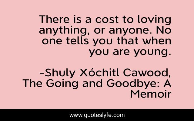 This page presents the quote "There is a cost to loving anything, or anyone. No one tells you that when you are young.". Author of this quote is Shuly Xóchitl Cawood, The Going and Goodbye: A Memoir. This quote is about memoir, memoirs,.