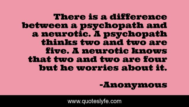 This page presents the quote "There is a difference between a psychopath and a neurotic. A psychopath thinks two and two are five. A neurotic knows that two and two are four but he worries about it.". Author of this quote is Anonymous. This quote is about anxiety, worry,.
