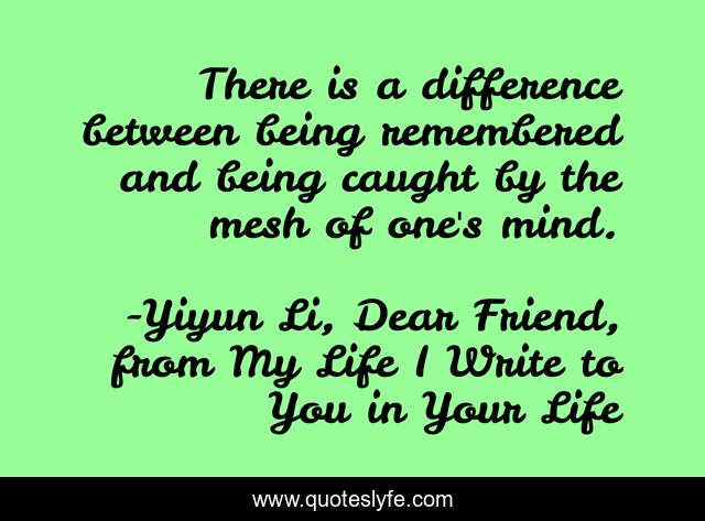 This page presents the quote "There is a difference between being remembered and being caught by the mesh of one's mind.". Author of this quote is Yiyun Li, Dear Friend, from My Life I Write to You in Your Life. This quote is about mind, recognition, memory,.