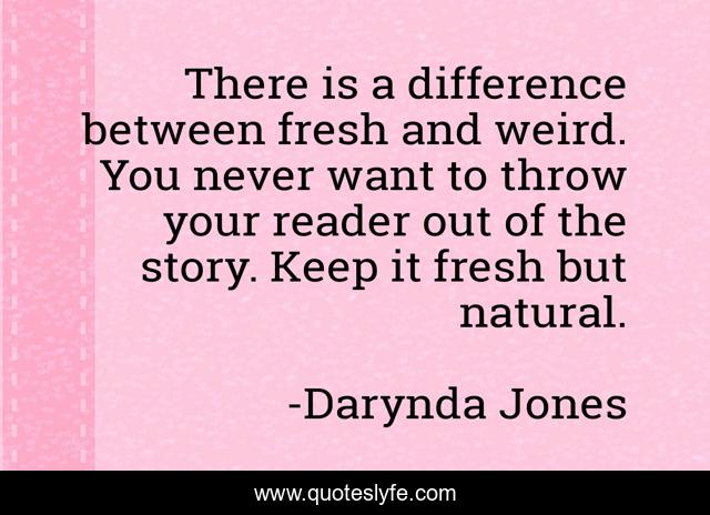 This page presents the quote "There is a difference between fresh and weird. You never want to throw your reader out of the story. Keep it fresh but natural.". Author of this quote is Darynda Jones. This quote is about writing, writing-process, writing-advice,.