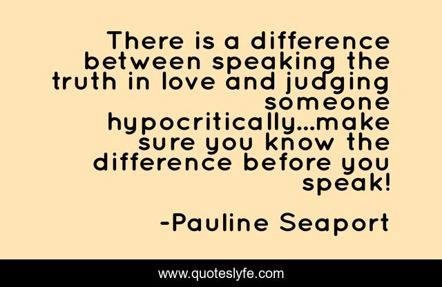 This page presents the quote "There is a difference between speaking the truth in love and judging someone hypocritically...make sure you know the difference before you speak!". Author of this quote is Pauline Seaport. This quote is about judgement, think-before-you-speak, difference, honesty, truth,.