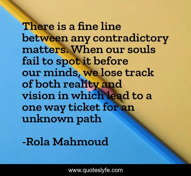 This page presents the quote "There is a fine line between any contradictory matters. When our souls fail to spot it before our minds, we lose track of both reality and vision in which lead to a one way ticket for an unknown path". Author of this quote is Rola Mahmoud. This quote is about track, mind, soul, rola-mahmoud, reality, path, vision,.