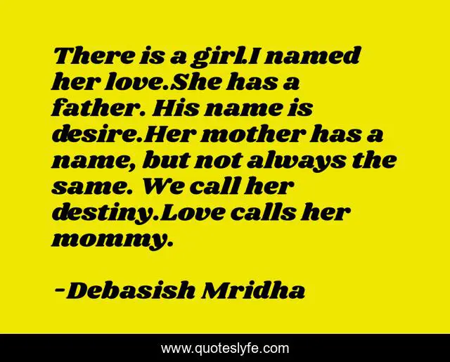 This page presents the quote "There is a girl.I named her love.She has a father. His name is desire.Her mother has a name, but not always the same. We call her destiny.Love calls her mommy.". Author of this quote is Debasish Mridha. This quote is about life, love, knowledge, inspirational, intelligence, philosophy, wisdom, quotes, affection,.