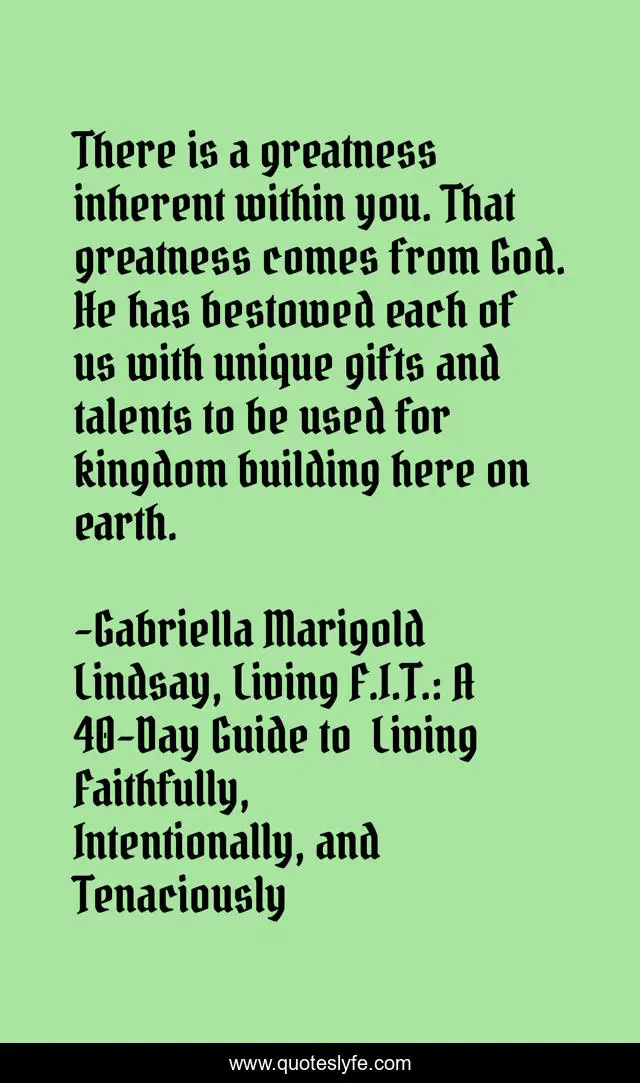 This page presents the quote "There is a greatness inherent within you. That greatness comes from God. He has bestowed each of us with unique gifts and talents to be used for kingdom building here on earth.". Author of this quote is Gabriella Marigold Lindsay, Living F.I.T.: A 40-Day Guide to Living Faithfully, Intentionally, and Tenaciously. This quote is about kingdom, gifts, christian, ability, greatness-in-you, god, kingdom-of-god, earth, greatness,.