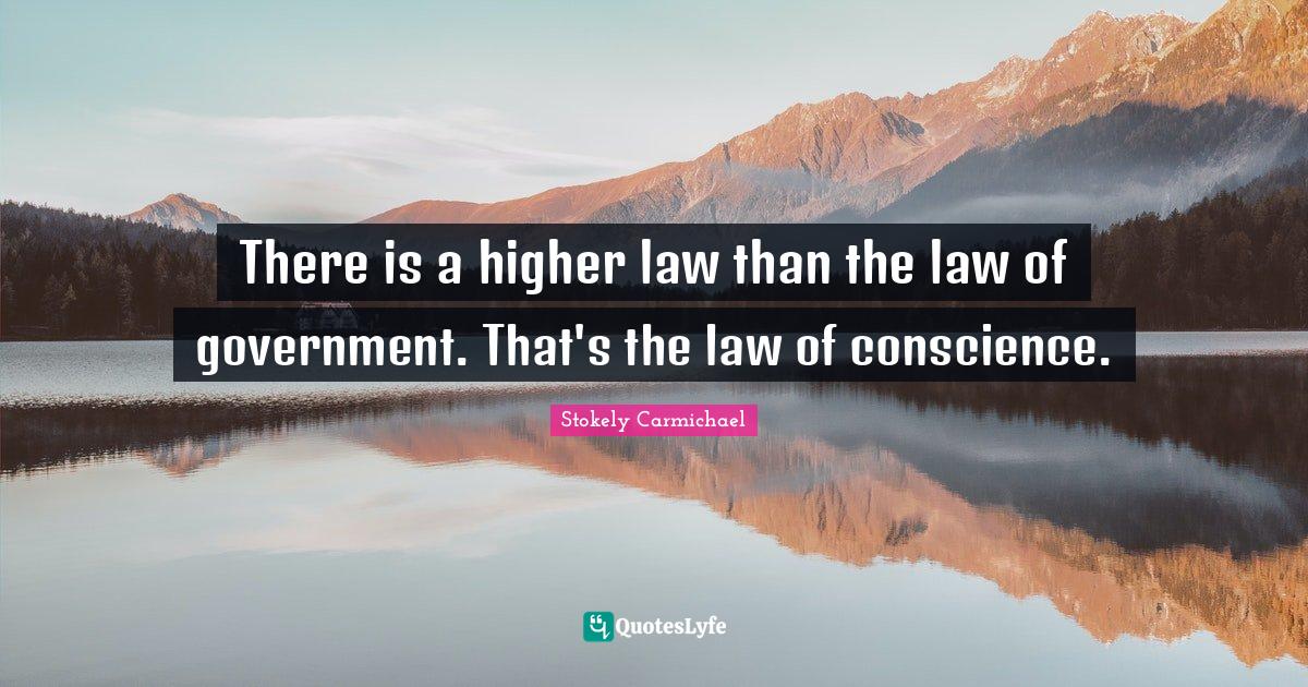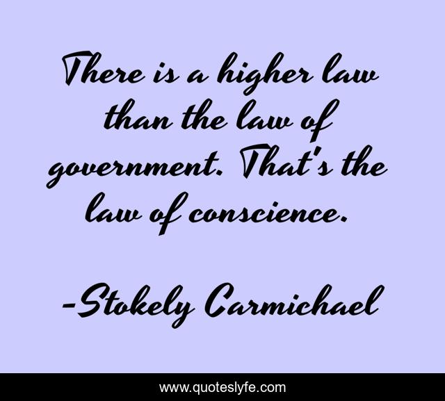 This page presents the quote "There is a higher law than the law of government. That's the law of conscience.". Author of this quote is Stokely Carmichael. This quote is about conscience, law, higher,.