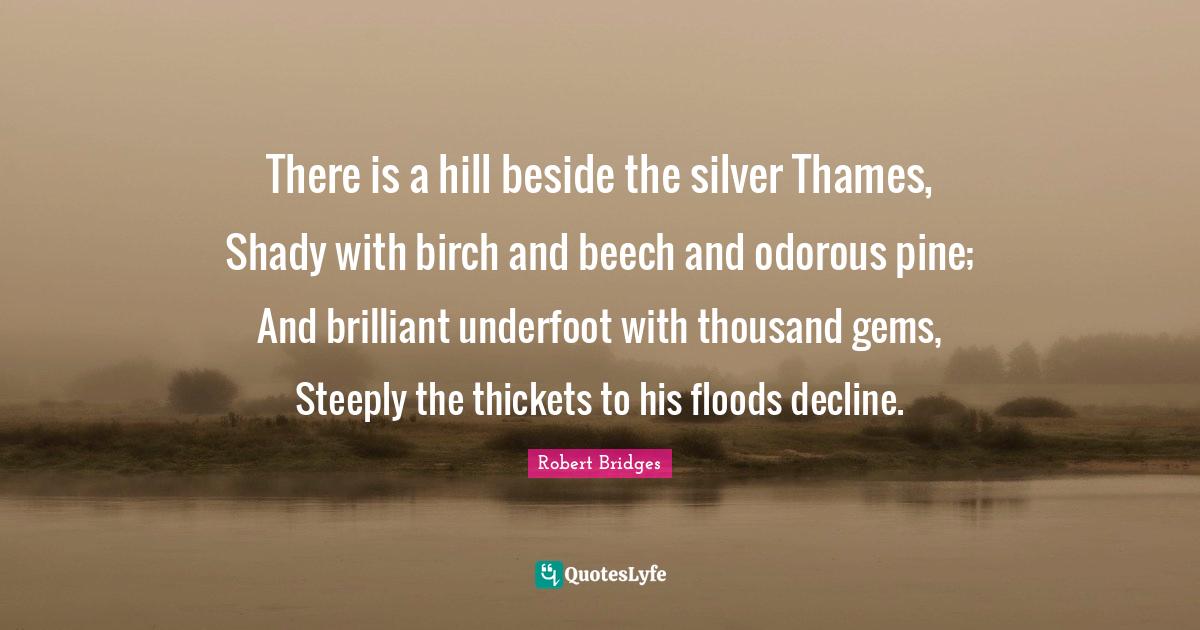 This page presents the quote "There is a hill beside the silver Thames, Shady with birch and beech and odorous pine; And brilliant underfoot with thousand gems, Steeply the thickets to his floods decline.". Author of this quote is Robert Bridges. This quote is about decline, thames, brilliant, hills, silver, shady, thousand, gems,.