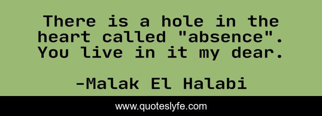This page presents the quote "There is a hole in the heart called "absence". You live in it my dear.". Author of this quote is Malak El Halabi. This quote is about absence, hurt, love, affection, missing,.