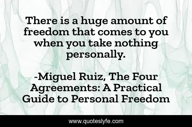 This page presents the quote "There is a huge amount of freedom that comes to you when you take nothing personally.". Author of this quote is Miguel Ruiz, The Four Agreements: A Practical Guide to Personal Freedom. This quote is about distance, equanimity, letting-go, freedom, self-centeredness, perspective,.