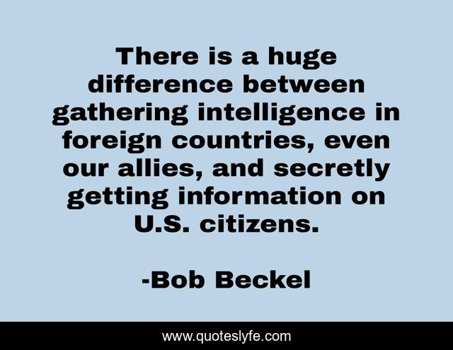 This page presents the quote "There is a huge difference between gathering intelligence in foreign countries, even our allies, and secretly getting information on U.S. citizens.". Author of this quote is Bob Beckel. This quote is about information, difference,.