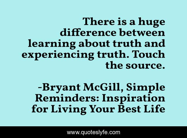 This page presents the quote "There is a huge difference between learning about truth and experiencing truth. Touch the source.". Author of this quote is Bryant McGill, Simple Reminders: Inspiration for Living Your Best Life. This quote is about source, differences, experiences, learning, truth,.