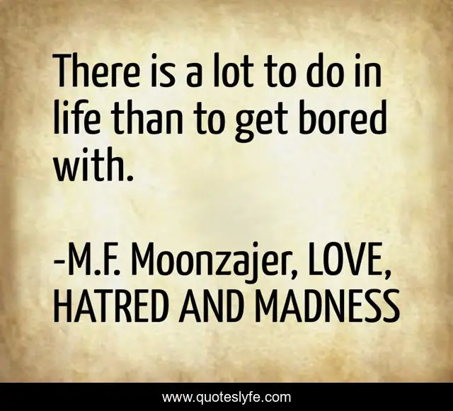 This page presents the quote "There is a lot to do in life than to get bored with.". Author of this quote is M.F. Moonzajer, LOVE, HATRED AND MADNESS. This quote is about thinking, life, bored, love, affection,.