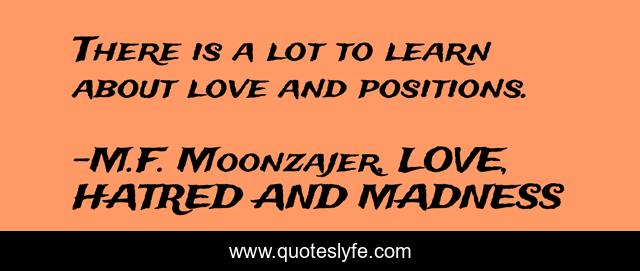 This page presents the quote "There is a lot to learn about love and positions.". Author of this quote is M.F. Moonzajer, LOVE, HATRED AND MADNESS. This quote is about funny, love, positions, learning, fun, comedy, affection,.
