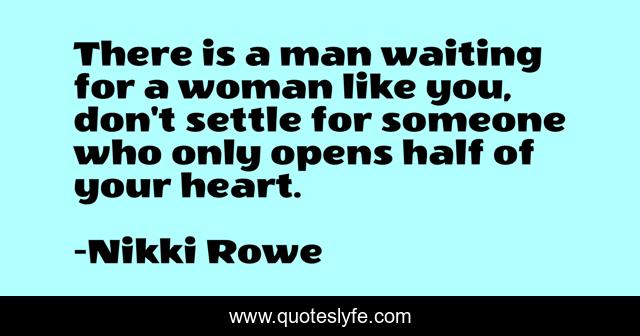 This page presents the quote "There is a man waiting for a woman like you, don't settle for someone who only opens half of your heart.". Author of this quote is Nikki Rowe. This quote is about love, destiny, fate, patience, twin-flame, meant-to-be, love-story, wild, twin-soul,.