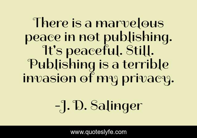 This page presents the quote "There is a marvelous peace in not publishing. It's peaceful. Still. Publishing is a terrible invasion of my privacy.". Author of this quote is J. D. Salinger. This quote is about peaceful, privacy,.