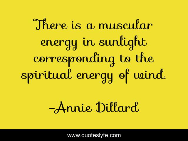 This page presents the quote "There is a muscular energy in sunlight corresponding to the spiritual energy of wind.". Author of this quote is Annie Dillard. This quote is about spiritual, energy, wind,.