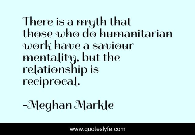 This page presents the quote "There is a myth that those who do humanitarian work have a saviour mentality, but the relationship is reciprocal.". Author of this quote is Meghan Markle. This quote is about work, mentality, myth,.