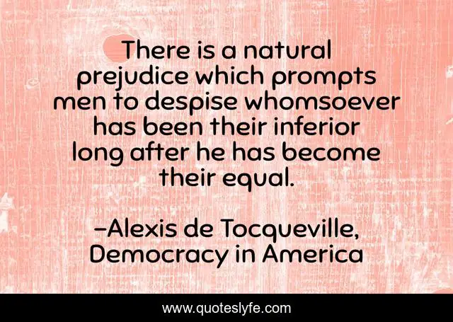 This page presents the quote "There is a natural prejudice which prompts men to despise whomsoever has been their inferior long after he has become their equal.". Author of this quote is Alexis de Tocqueville, Democracy in America. This quote is about culture, bias, bigotry, habit,.