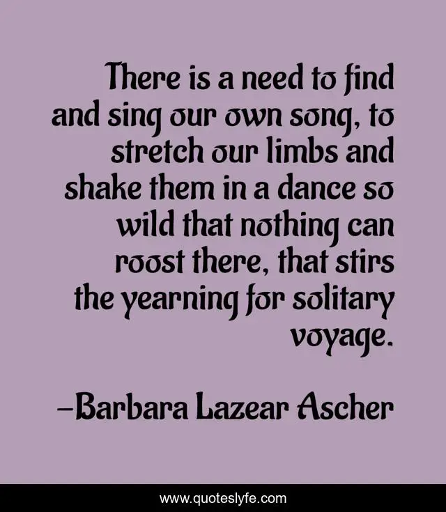 This page presents the quote "There is a need to find and sing our own song, to stretch our limbs and shake them in a dance so wild that nothing can roost there, that stirs the yearning for solitary voyage.". Author of this quote is Barbara Lazear Ascher. This quote is about dance, wild,.