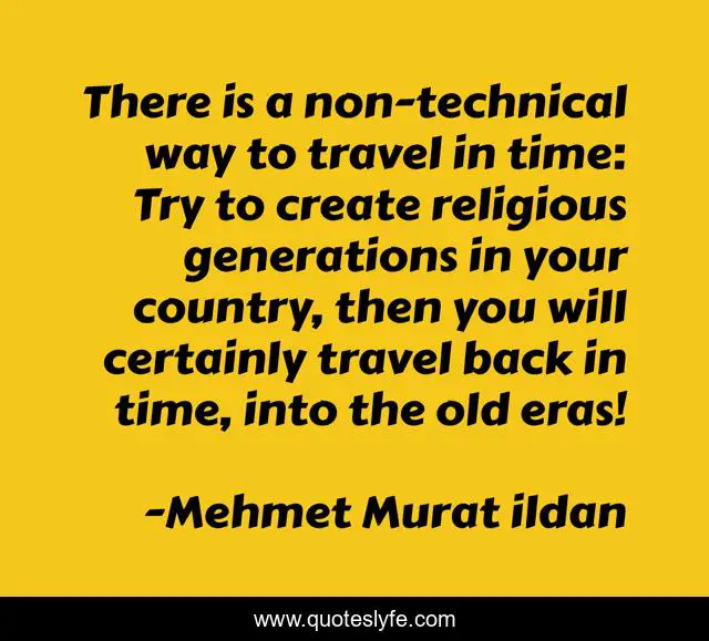 This page presents the quote "There is a non-technical way to travel in time: Try to create religious generations in your country, then you will certainly travel back in time, into the old eras!". Author of this quote is Mehmet Murat ildan. This quote is about time-voyage, old-eras, time-traveling, devout-generations, ancient-times, mehmet-murat-ildan, ildan-wise-sayings, turkish, ildan-wisdom,.