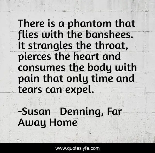 This page presents the quote "There is a phantom that flies with the banshees. It strangles the throat, pierces the heart and consumes the body with pain that only time and tears can expel.". Author of this quote is Susan Denning, Far Away Home. This quote is about grief, death,.