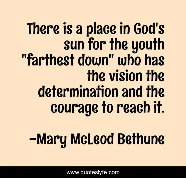 This page presents the quote "There is a place in God's sun for the youth "farthest down" who has the vision the determination and the courage to reach it.". Author of this quote is Mary McLeod Bethune. .