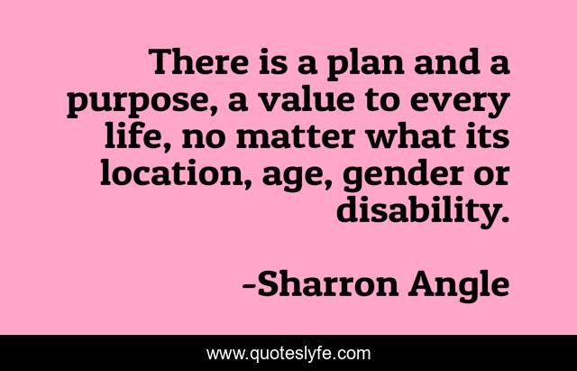 This page presents the quote "There is a plan and a purpose, a value to every life, no matter what its location, age, gender or disability.". Author of this quote is Sharron Angle. This quote is about life, disability, value,.