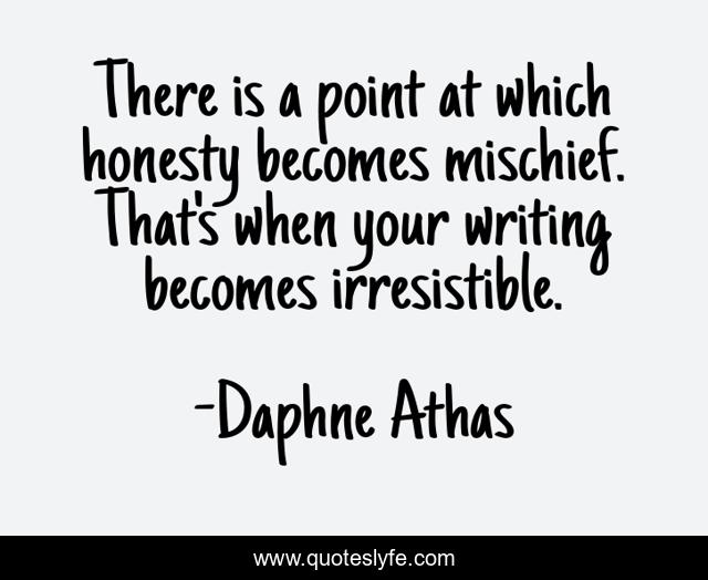 This page presents the quote "There is a point at which honesty becomes mischief. That's when your writing becomes irresistible.". Author of this quote is Daphne Athas. .