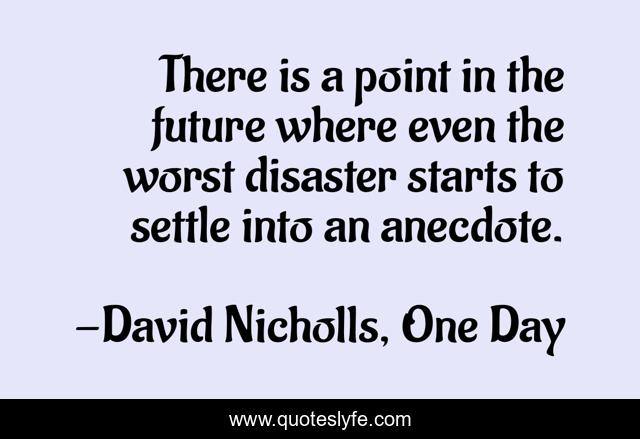 This page presents the quote "There is a point in the future where even the worst disaster starts to settle into an anecdote.". Author of this quote is David Nicholls, One Day. This quote is about funny, disaster, humour, anecdote, nostalgia, failure, memory, comedy, laughter,.
