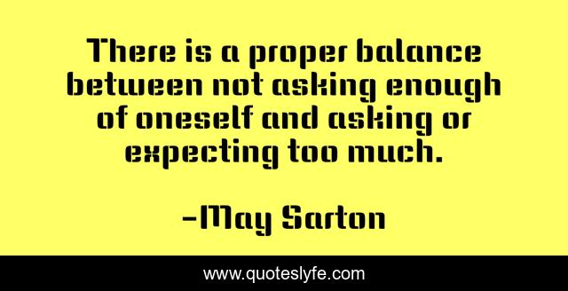 This page presents the quote "There is a proper balance between not asking enough of oneself and asking or expecting too much.". Author of this quote is May Sarton. This quote is about realistic, expectations,.