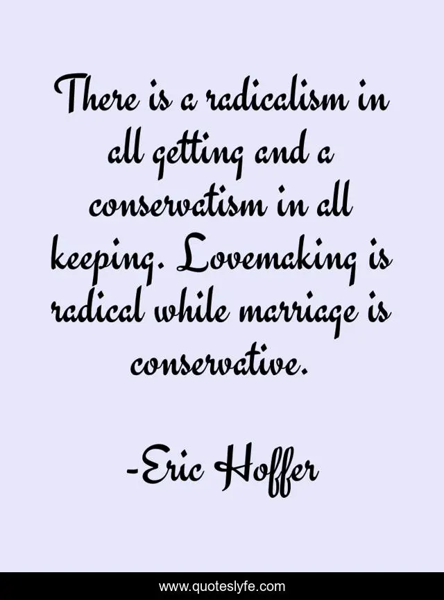 This page presents the quote "There is a radicalism in all getting and a conservatism in all keeping. Lovemaking is radical while marriage is conservative.". Author of this quote is Eric Hoffer. .
