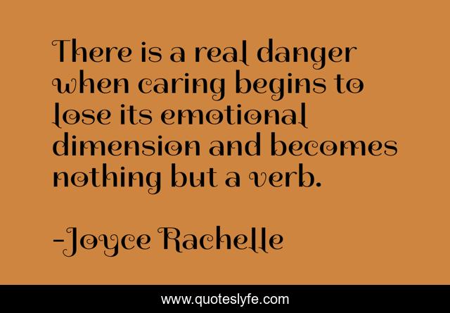 This page presents the quote "There is a real danger when caring begins to lose its emotional dimension and becomes nothing but a verb.". Author of this quote is Joyce Rachelle. This quote is about caring, genuine-caring, sincerity,.
