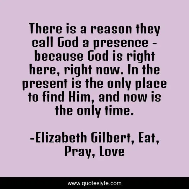 This page presents the quote "There is a reason they call God a presence - because God is right here, right now. In the present is the only place to find Him, and now is the only time.". Author of this quote is Elizabeth Gilbert, Eat, Pray, Love. .