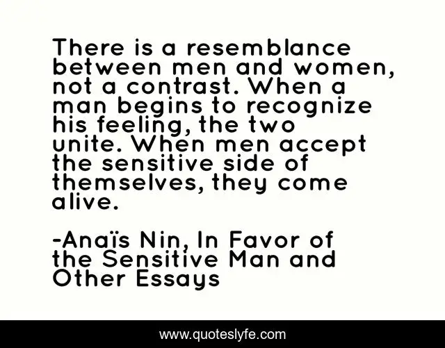 This page presents the quote "There is a resemblance between men and women, not a contrast. When a man begins to recognize his feeling, the two unite. When men accept the sensitive side of themselves, they come alive.". Author of this quote is Anaïs Nin, In Favor of the Sensitive Man and Other Essays. This quote is about gender, femininity, masculinity,.