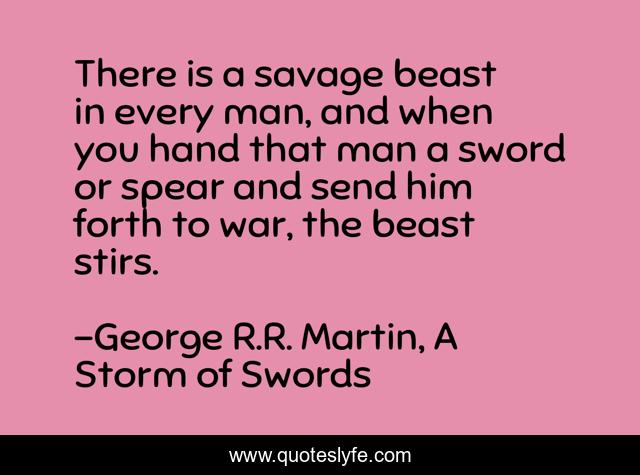 This page presents the quote "There is a savage beast in every man, and when you hand that man a sword or spear and send him forth to war, the beast stirs.". Author of this quote is George R.R. Martin, A Storm of Swords. This quote is about beast, human-nature, savagery, war,.