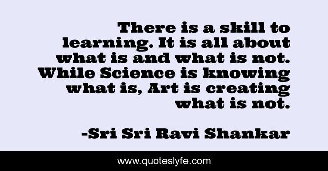 This page presents the quote "There is a skill to learning. It is all about what is and what is not. While Science is knowing what is, Art is creating what is not.". Author of this quote is Sri Sri Ravi Shankar. This quote is about enthusiasm, education, inspirational,.