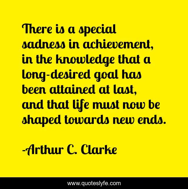 This page presents the quote "There is a special sadness in achievement, in the knowledge that a long-desired goal has been attained at last, and that life must now be shaped towards new ends.". Author of this quote is Arthur C. Clarke. This quote is about achievement, goals, science-fiction,.