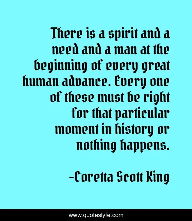 This page presents the quote "There is a spirit and a need and a man at the beginning of every great human advance. Every one of these must be right for that particular moment in history or nothing happens.". Author of this quote is Coretta Scott King. .