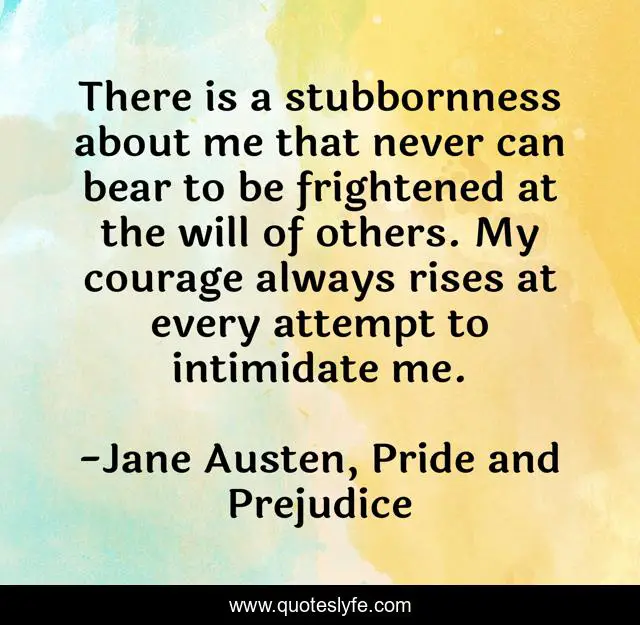 This page presents the quote "There is a stubbornness about me that never can bear to be frightened at the will of others. My courage always rises at every attempt to intimidate me.". Author of this quote is Jane Austen, Pride and Prejudice. This quote is about dignity, empowerment, strength, self-determination, stubbornness, elizabeth-bennet, intimidation, courage, fear,.