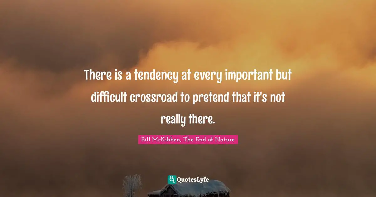 This page presents the quote "There is a tendency at every important but difficult crossroad to pretend that it's not really there.". Author of this quote is Bill McKibben, The End of Nature. This quote is about environment, judgement, challenge,.