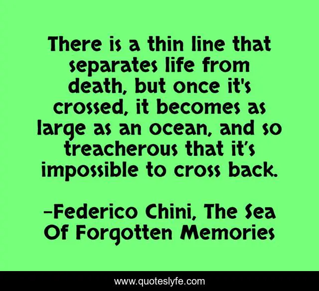 This page presents the quote "There is a thin line that separates life from death, but once it's crossed, it becomes as large as an ocean, and so treacherous that it’s impossible to cross back.". Author of this quote is Federico Chini, The Sea Of Forgotten Memories. This quote is about death-and-dying, sea,.