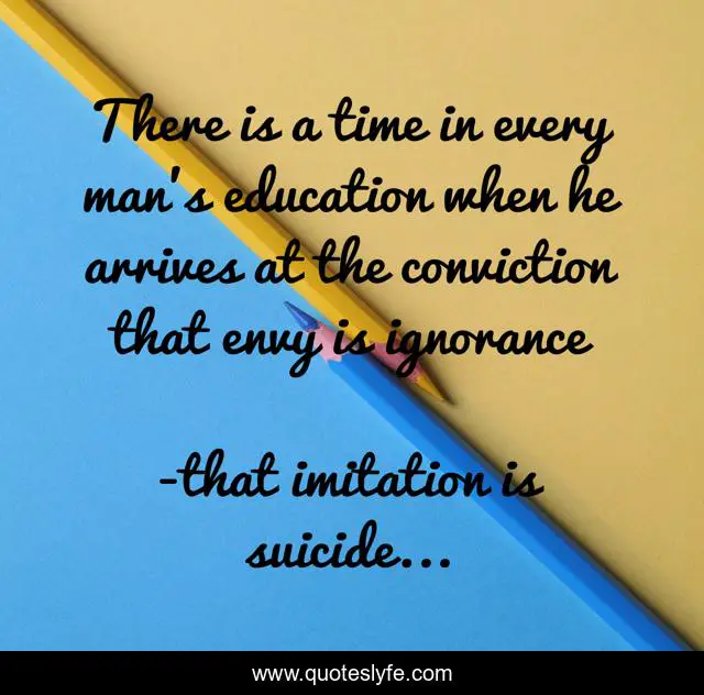 This page presents the quote "There is a time in every man’s education when he arrives at the conviction that envy is ignorance". Author of this quote is that imitation is suicide.... This quote is about ralph waldo emerson, self-reliance,.