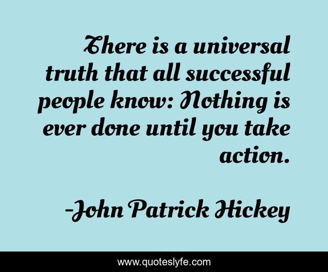 This page presents the quote "There is a universal truth that all successful people know: Nothing is ever done until you take action.". Author of this quote is John Patrick Hickey. This quote is about success, personal-growth, action, achievement, personal-development, goal-setting, goals,.