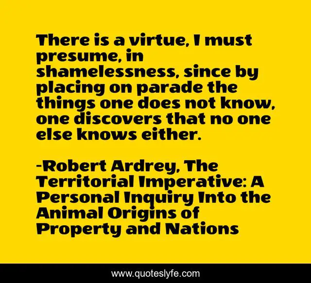 This page presents the quote "There is a virtue, I must presume, in shamelessness, since by placing on parade the things one does not know, one discovers that no one else knows either.". Author of this quote is Robert Ardrey, The Territorial Imperative: A Personal Inquiry Into the Animal Origins of Property and Nations. This quote is about discovery, presume, virtue, shameless, parade,.