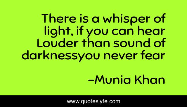 This page presents the quote "There is a whisper of light, if you can hear Louder than sound of darknessyou never fear". Author of this quote is Munia Khan. This quote is about sound, darkness, light, dark, louder, hear, whisper, fear, sounds,.