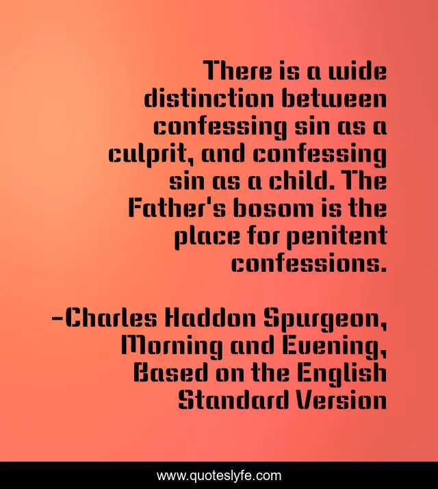 This page presents the quote "There is a wide distinction between confessing sin as a culprit, and confessing sin as a child. The Father's bosom is the place for penitent confessions.". Author of this quote is Charles Haddon Spurgeon, Morning and Evening, Based on the English Standard Version. This quote is about parenthood, repentance, discipleship, intimacy-with-god, confession,.